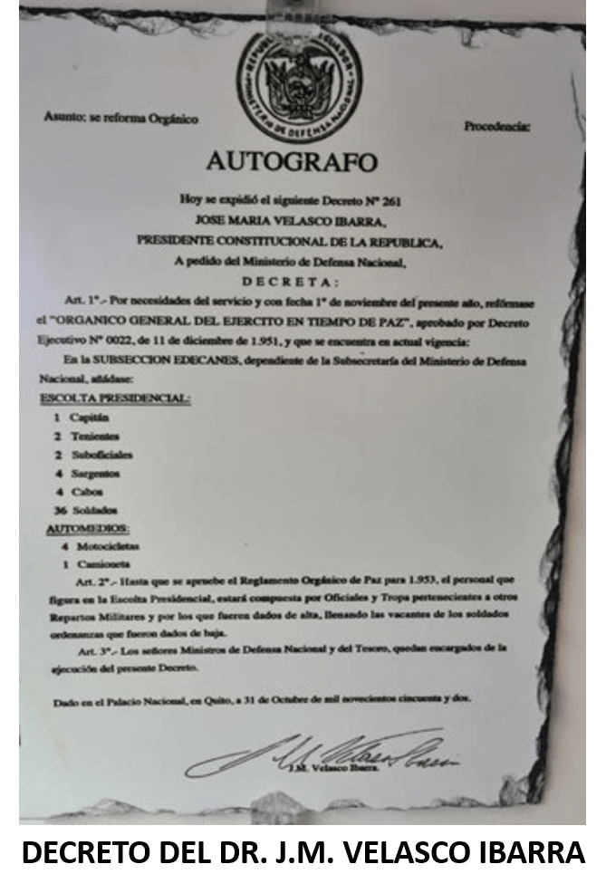 El 31 de OCTUBRE de 1952 durante el gobierno del Sr. Dr. JOSÉ MARÍA VELASCO IBARRA con Decreto Ejecutivo No. 261 del 31 de OCTUBRE de 1952, se procede a reformar el orgánico de la seguridad del Sr. Presidente, añadiendo la SUB-SECCIÓN DE EDECANES a LA ESCOLTA PRESIDENCIAL comandada por el Sr. Capt. ARTURO MOSCOSO; quien solicitó a las mejores Clases del Grupo “FEBRES CORDERO”, así también, la dotación de NOVENTA (90) caballos (castaños, alazanes y negros) que fueron adquiridos en ARGENTINA.