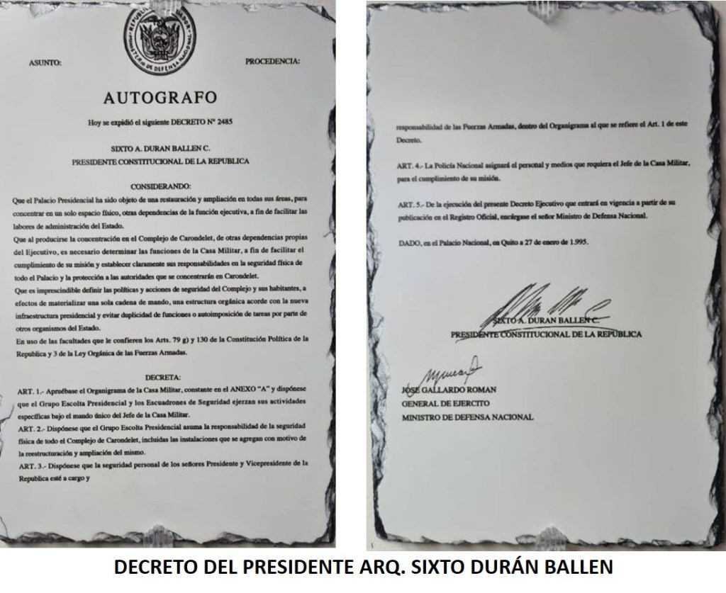 Cabe mencionar que como Superior Militar directo y encargado de las coordinaciones y enlace con el MDN y el Sr. Presidente, se encontraba el Sr. Crnl. de Avc. RODRIGO BOHÓRQUEZ, quien consiente de la enorme responsabilidad como Jefe de la Casa Militar, supo cumplir a cabalidad su delicada función, hasta que fue relevado de su cargo el mismo día 21 de ENERO en horas de la mañana por mi Grab. CARLOS MONCAYO GALLEGOS, oficial General nombrado por el COMACO para asumir el mando y control de las tropas que se encontraban en el Palacio y en el edificio de “LA UNIÓN” en la calle CHILE y las que proporcionaban la seguridad al Congreso Nacional.